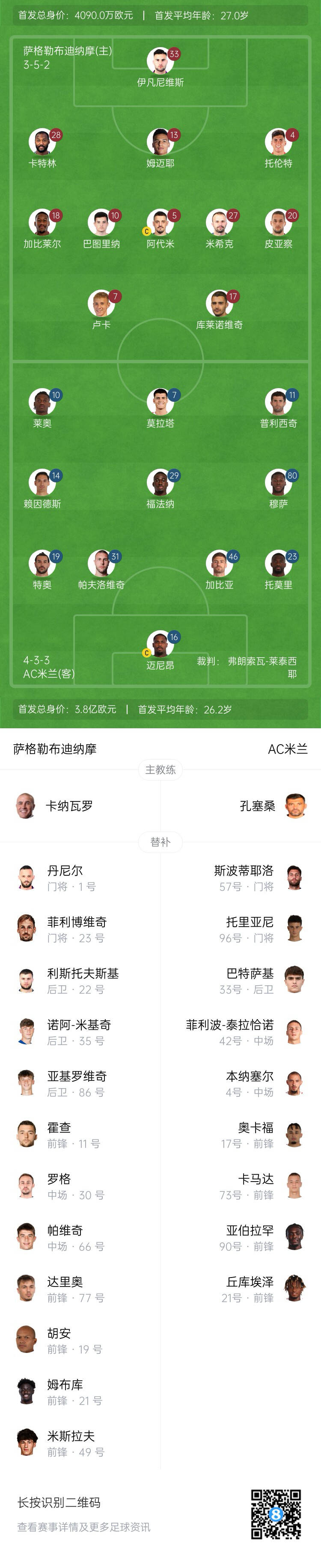 米蘭首發(fā):16-邁尼昂、23-托莫里、46-加比亞、31-帕夫洛維奇、19-特奧、80-穆薩、29-福法納、14-賴因德斯、11-普利西奇、7-莫拉塔、10-萊奧
