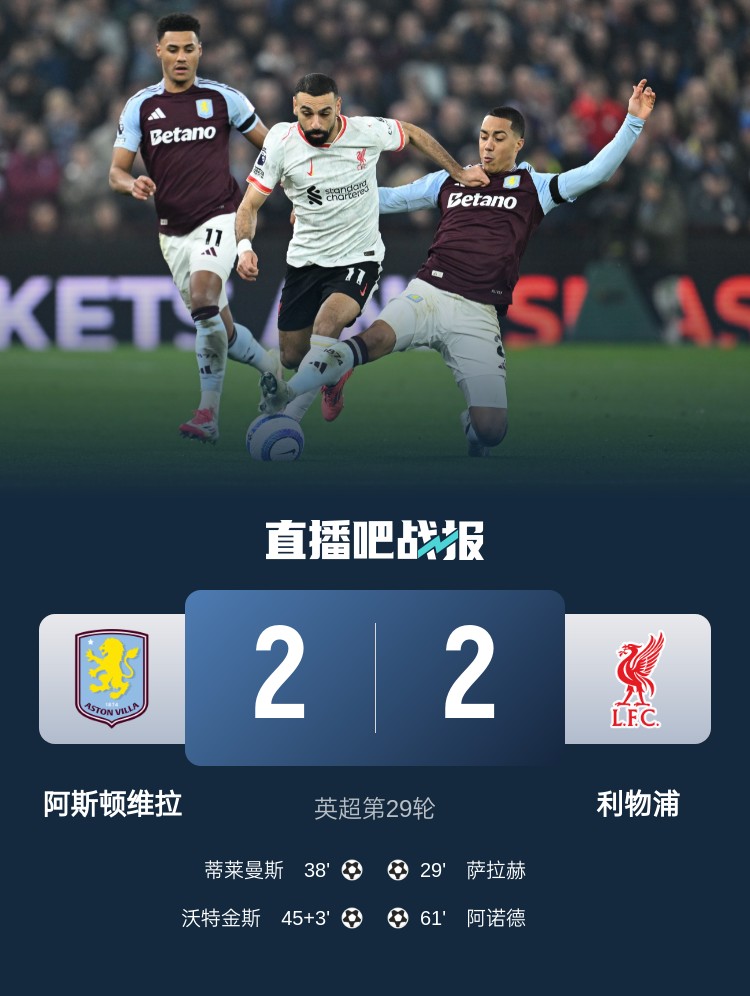 英超第29輪,利物浦2-2戰(zhàn)平維拉。上半場,加西亞回傳送禮,若塔搶斷后助攻薩拉赫破門,蒂萊曼斯扳平,沃特金斯頭球助維拉反超;下半場,薩拉赫助攻阿諾德進球,利物浦扳平比分,努涅斯屢次錯失良機。