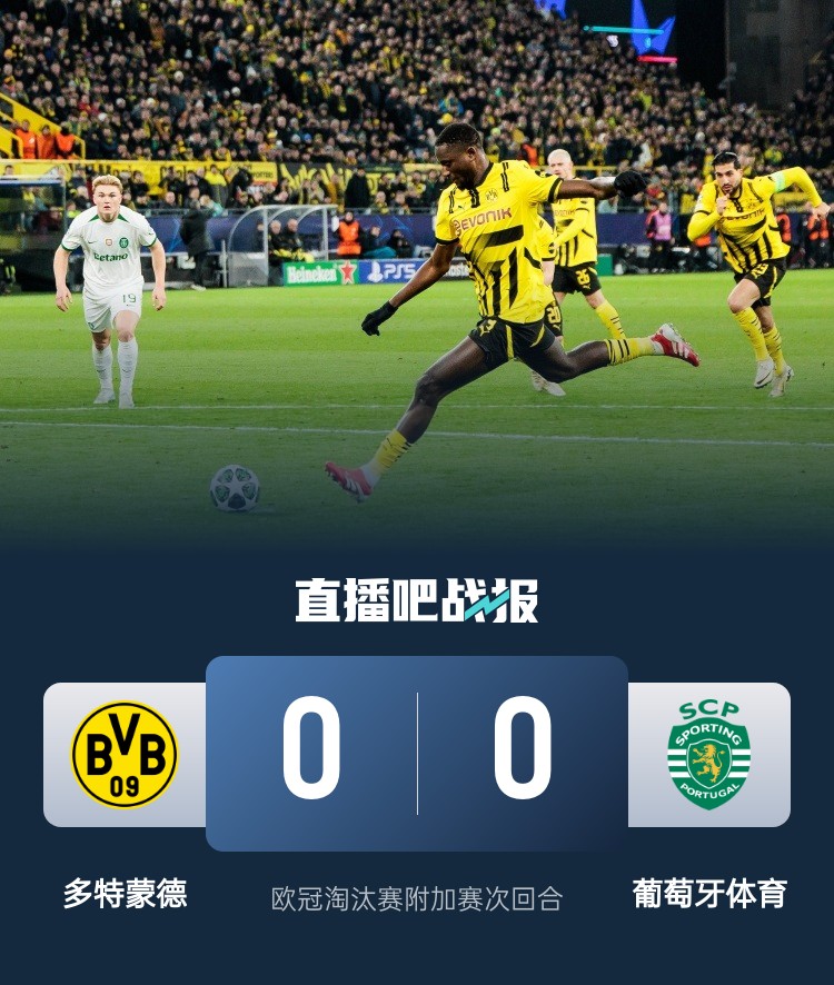 歐冠淘汰賽附加賽次回合,多特0-0葡萄牙體育,總比分3-0晉級16強。上半場,多特占據(jù)場上主動多次威脅球門,可惜未能把握住進球機會;下半場,阿德耶米造點,吉拉西主罰點球被撲,雷納單刀中柱,埃姆雷-詹進球被吹。