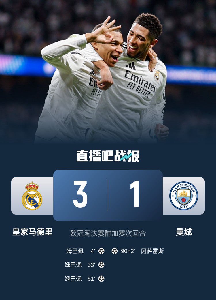 姆巴佩戴帽!皇馬3-1曼城總比分6-3晉級16強 下輪戰(zhàn)馬競或藥廠
