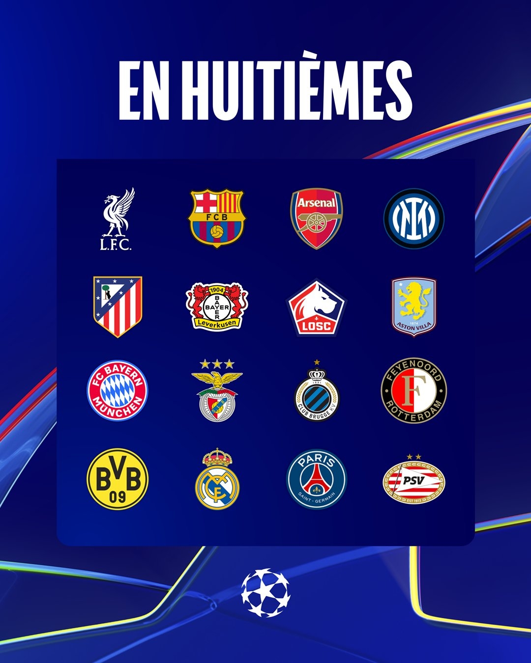 附加賽晉級8隊(duì):本菲卡、拜仁慕尼黑、費(fèi)耶諾德、布魯日、多特蒙德、巴黎圣日耳曼、皇家馬德里、埃因霍溫