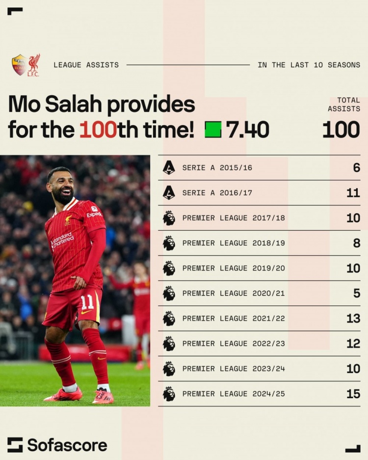 此外,在近10個賽季中,薩拉赫在聯(lián)賽中的助攻總數(shù)已經(jīng)達到了100次,他是五大聯(lián)賽中第四位做到這一點的球員。此前三位分別是德布勞內(nèi)(117助攻)、穆勒(116助攻)和梅西(110助攻)。