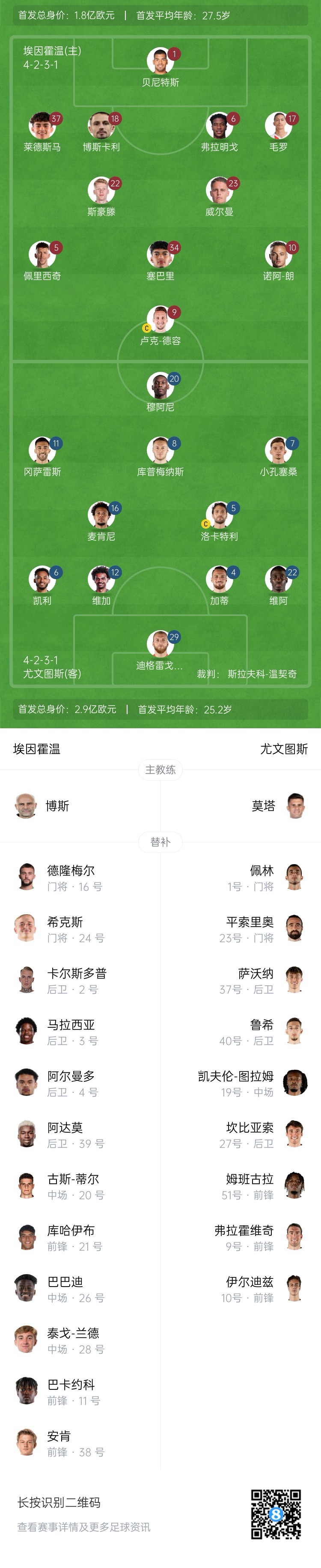 埃因霍溫首發(fā):1-沃爾特-貝尼特斯、37-萊德斯馬、18-博斯卡利、6-弗拉明戈、17-毛羅-儒尼奧爾、22-斯豪滕、23-威爾曼、5-佩里西奇、34-塞巴里、10-諾阿-朗、9-盧克-德容