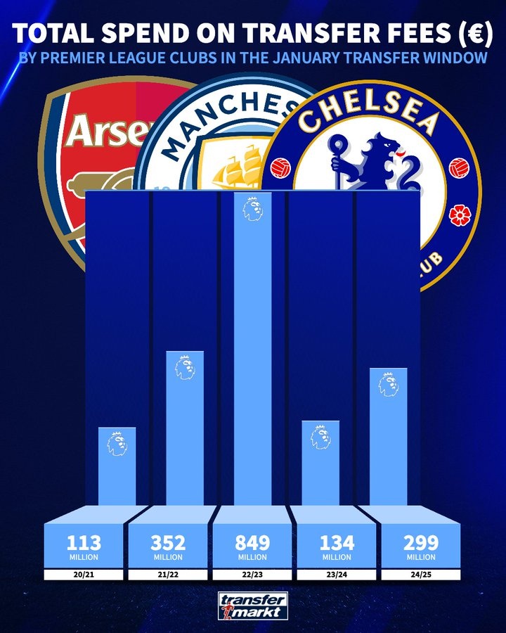英超近5個(gè)賽季冬窗消費(fèi)情況: