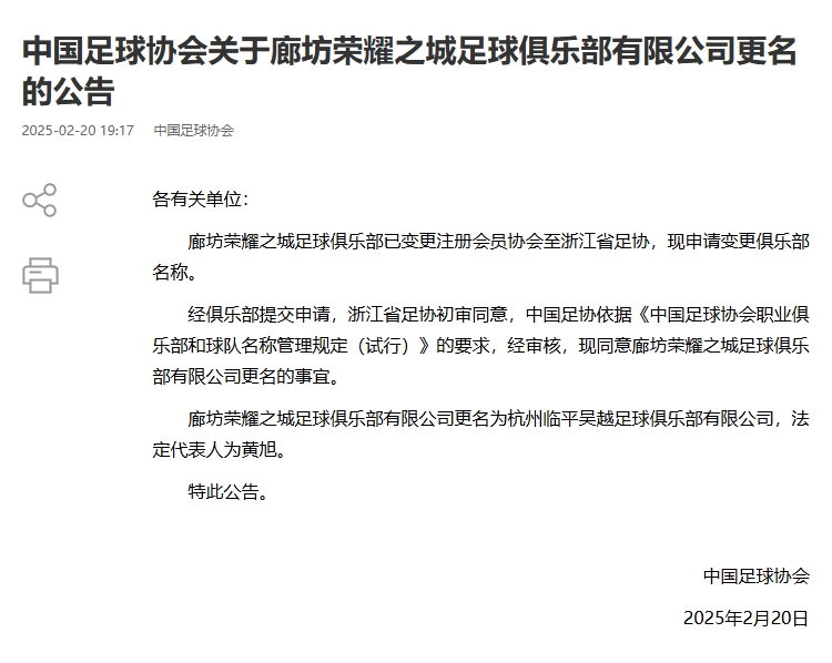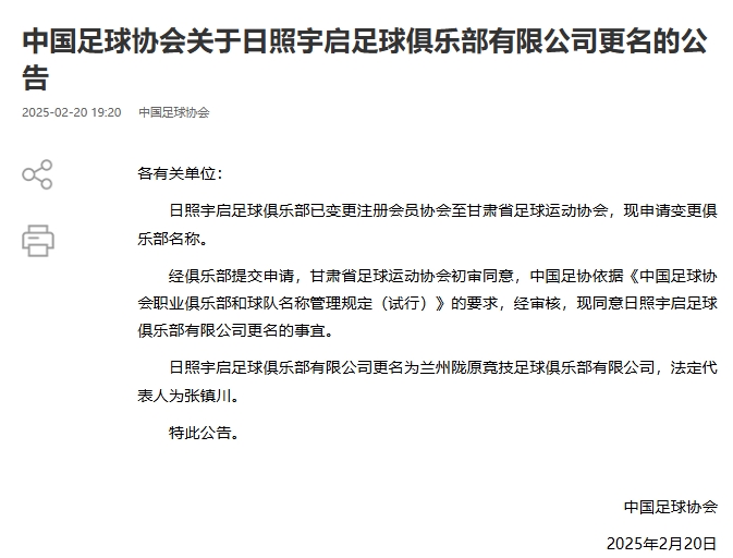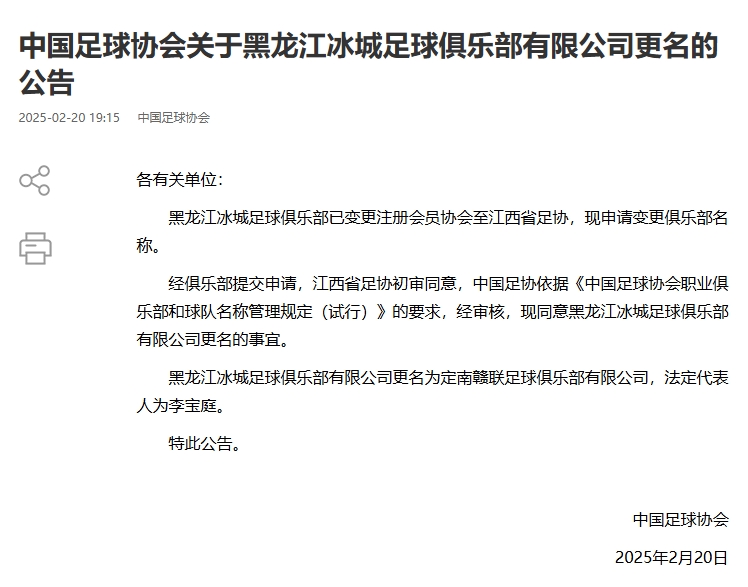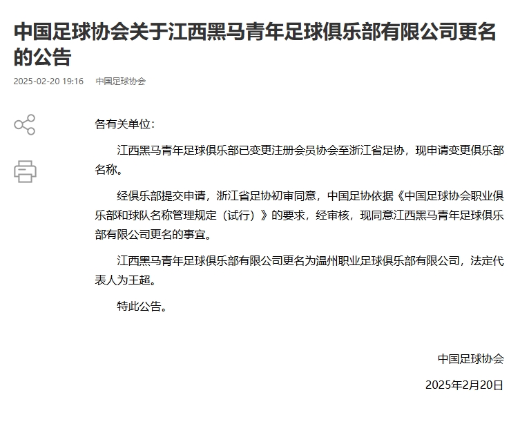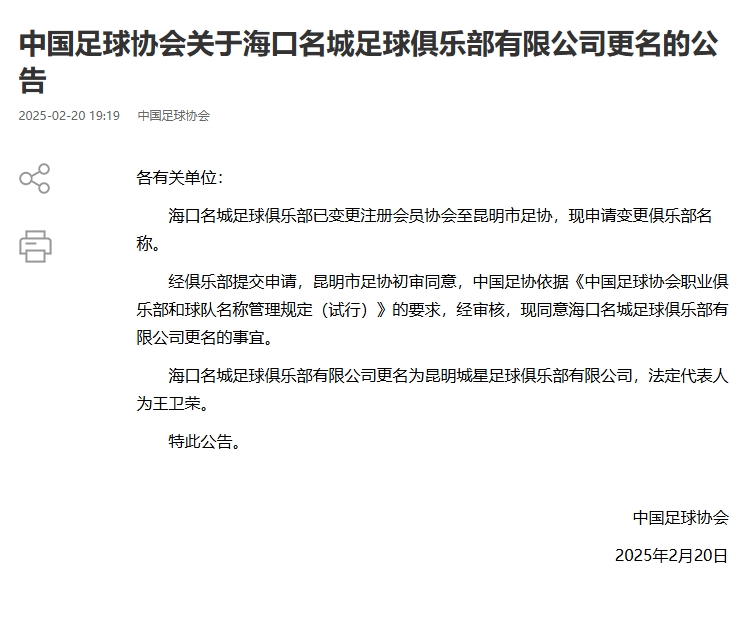 02月20日訊 中國足協(xié)官宣5家職業(yè)足球俱樂部的更名事宜,此前這5家俱樂部已經(jīng)變更注冊會(huì)員協(xié)會(huì),也就是俗稱的“異地搬遷”。