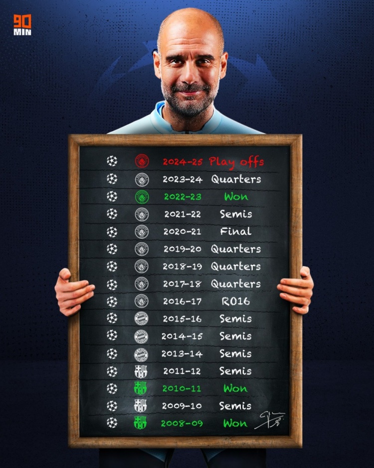 90min Football統(tǒng)計了瓜迪奧拉執(zhí)教生涯至今的歐冠成績,他帶隊獲得3次冠軍、1次亞軍,6次止步4強,本賽季是首次未進入16強。