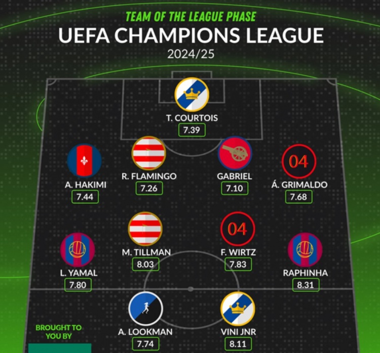 中場:亞馬爾(巴薩,7.80分)、蒂爾曼(埃因霍溫,8.03分)、維爾茨(勒沃庫森,7.83分)、拉菲尼亞(巴薩,8.31分)