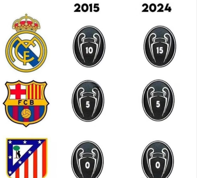 過去9年,西甲三強歐冠冠軍數的變化