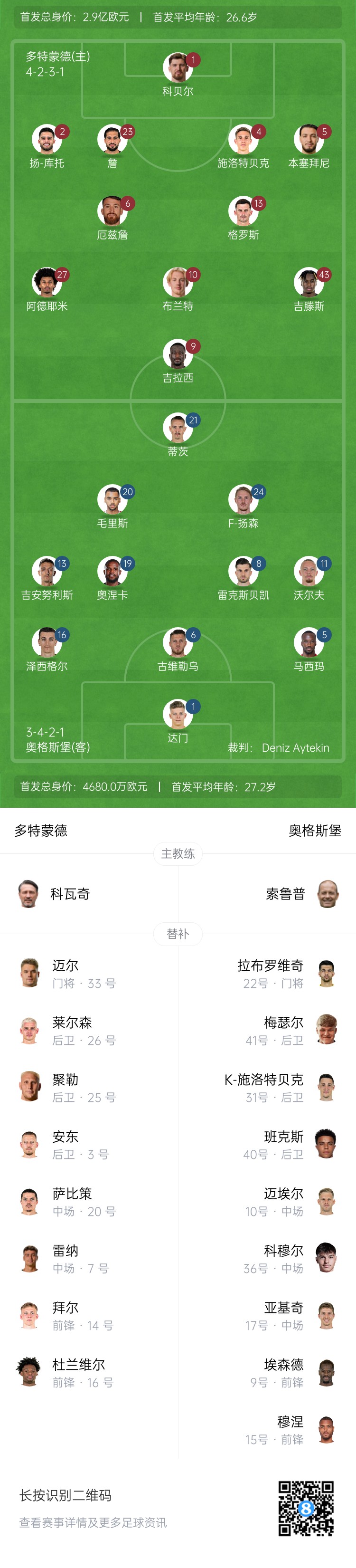 多特首發(fā):1-科貝爾、2-揚(yáng)庫(kù)托、4-施洛特貝克、5-本塞拜尼、6-厄茲詹、23-埃姆雷-詹、13-格羅斯、10-布蘭特、9-吉拉西、27-阿德耶米、43-吉滕斯
