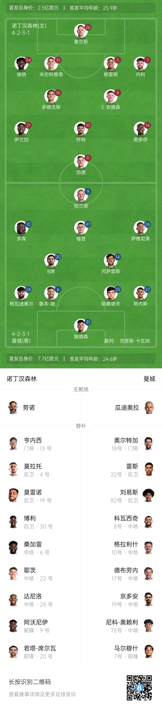 諾丁漢森林首發(fā):26-塞爾斯、5-穆里略、7-內(nèi)科-威廉姆斯、16-尼古拉斯-多明戈斯、31-米倫科維奇、34-埃納、8-埃利奧特-安德森、10-吉布斯-懷特、11-克里斯-伍德、14-奧多伊、21-伊蘭加