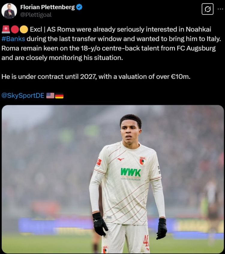 報道稱羅馬在上一個轉(zhuǎn)會窗就已經(jīng)認真考慮引進班克斯,球隊現(xiàn)在還一直關(guān)注著球員的情況。班克斯目前與奧格斯堡的合同將在2027年到期,預(yù)計的轉(zhuǎn)會身價超過1000萬歐。