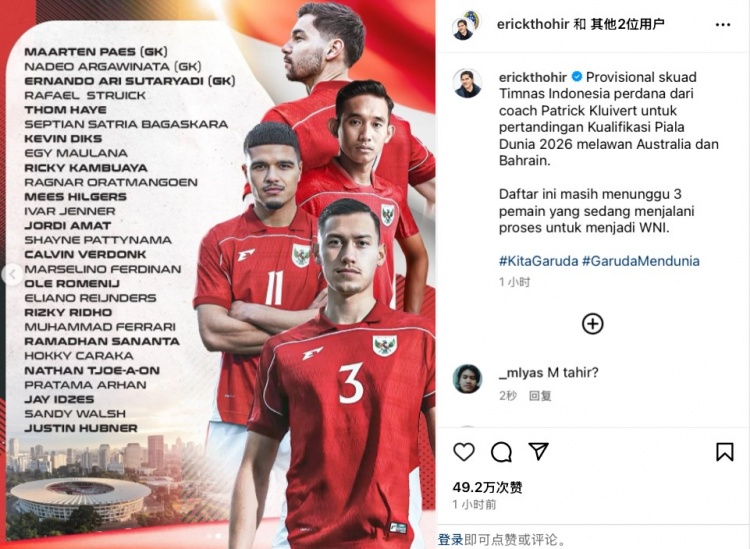 3月9日訊 今日,印尼足協(xié)主席托希爾更新社媒,曬出了印尼國(guó)家隊(duì)3月份18強(qiáng)賽大名單,迪克斯、伊澤斯、哈耶、帕斯、小賴(lài)因德斯、費(fèi)爾東克等歸化球員悉數(shù)入選。