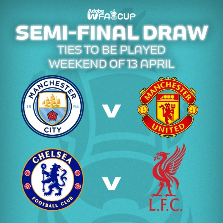 經(jīng)過(guò)抽簽,女足足總杯半決賽對(duì)陣為曼城vs曼聯(lián)、切爾西vs利物浦,比賽將于4月13日的那個(gè)周末進(jìn)行。