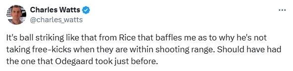 03月10日訊 英超第28輪,阿森納客場1-1戰(zhàn)平曼聯(lián)。比賽第74分鐘,賴斯用一腳漂亮的射門幫助阿森納扳平比分。在賴斯進球后,阿森納系的記者Charles Watts在社媒表示:“賴斯這樣的射門讓我困惑了,為什么獲得射程范圍以內(nèi)的任意球時不讓他去主罰呢?之前厄德高主罰的那個任意球應(yīng)該讓他去踢?!?/p> 本文標(biāo)簽: 足球 英超 阿森納 曼聯(lián)