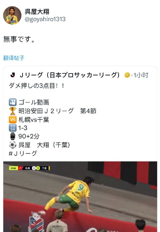 好在經(jīng)過一番檢查,吳屋大翔并無大礙,并回到球場繼續(xù)比賽,比賽結(jié)束后,吳屋大翔也轉(zhuǎn)發(fā)了自己“出糗”視頻,并寫道“平安無事。”,再次讓球迷們安心。