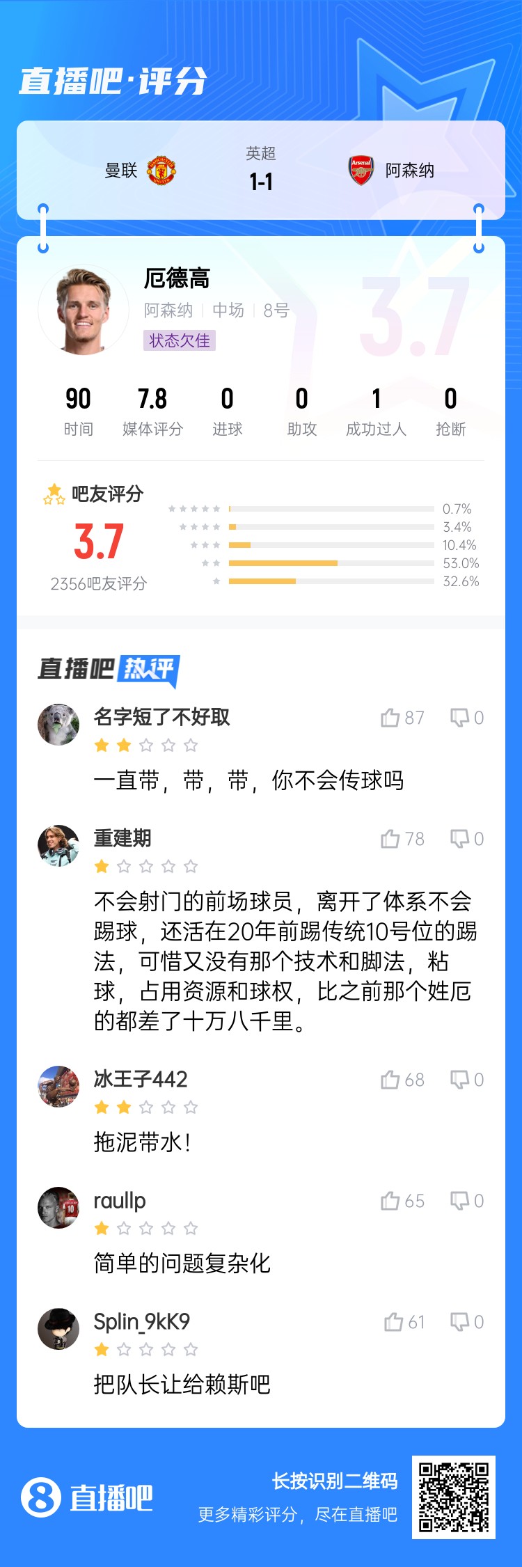 英超第28輪,阿森納客場(chǎng)1-1戰(zhàn)平曼聯(lián)。厄德高本場(chǎng)比賽首發(fā)踢滿(mǎn)全場(chǎng),發(fā)揮糟糕。賽后國(guó)外眾多球迷在社媒展開(kāi)了對(duì)厄德高的吐槽。 本文標(biāo)簽: 足球 英超 阿森納
