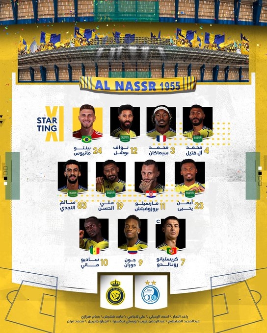 利雅得勝利替補:22-阿爾哈比、36-納賈爾、8-蘇萊西姆、16-馬蘭、20-安吉洛、22-阿馬德、29-加里卜、50-卡謝什、78-奧賈米、80-韋斯利-特謝拉、88-哈扎齊