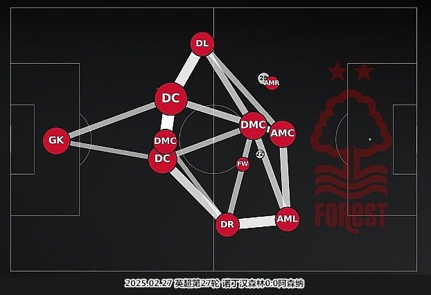 穆里略和米倫科維奇配合默契,埃蘭加和奧多伊可以深度退守保護邊后衛(wèi),克里斯-伍德總是在不停干擾對手的傳遞,吉布斯-懷特甚至能夠來到中衛(wèi)身前扮演清道夫……諾丁漢森林擁有正面防守能力出眾的中衛(wèi)組合,他們身邊聚集了多名柔韌性出眾、腳下纏斗能力強且愿意防守的攻擊手。努諾-桑托的球隊防守時頗具拉丁風(fēng)味,依靠錯落有致的三線結(jié)構(gòu)堵塞禁區(qū)空間,就是他們的招牌動作。