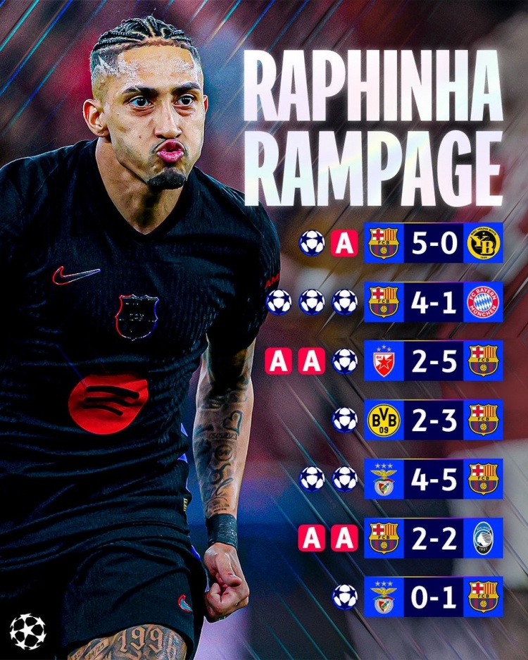 歐冠官方數(shù)據(jù)統(tǒng)計顯示,拉菲尼亞本賽季在9場歐冠有7場能夠直接參與進球,貢獻9球5助攻: