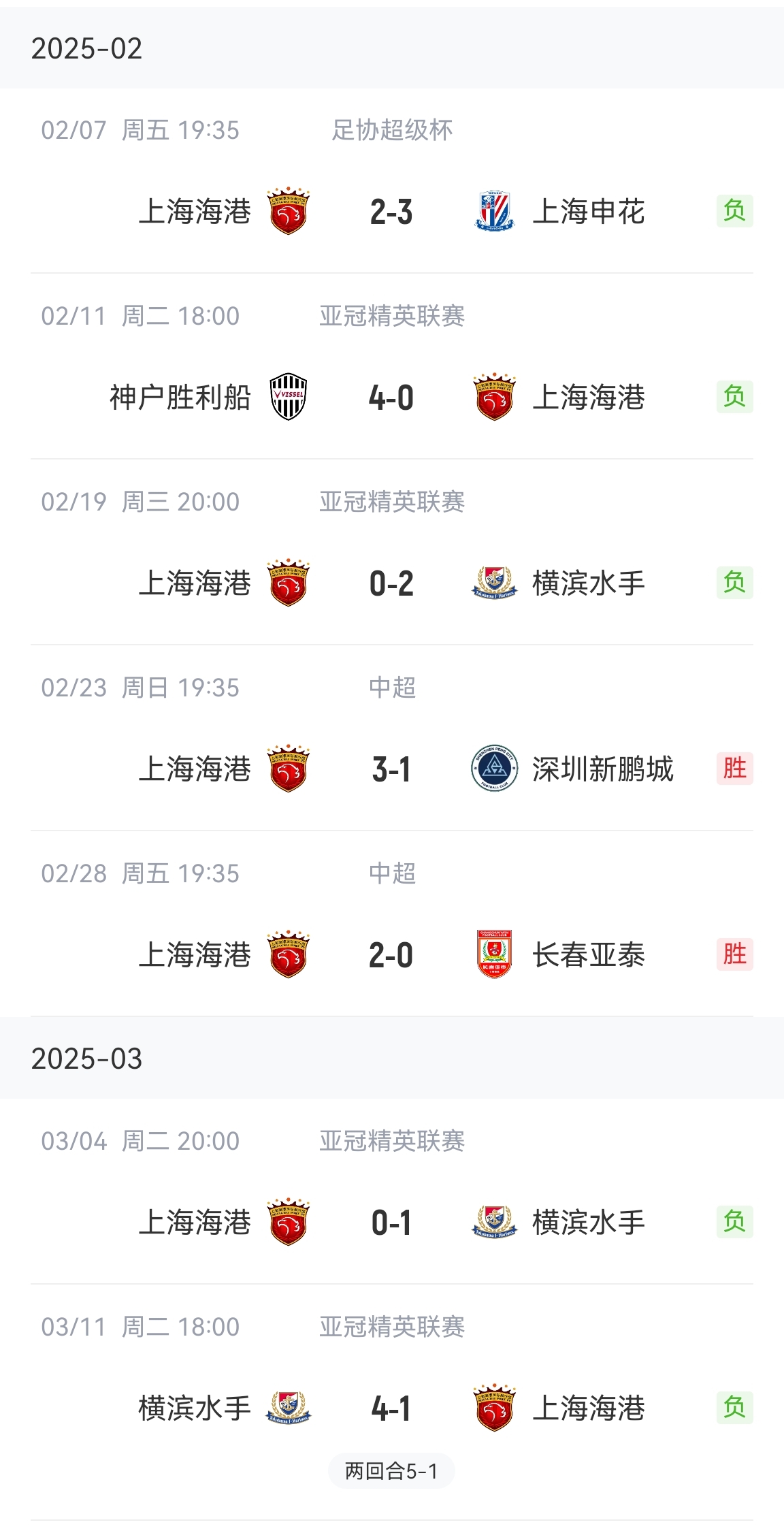 2025年海港超級杯2-3遭申花逆轉(zhuǎn),亞冠4場全敗,聯(lián)賽則取得了兩連勝。