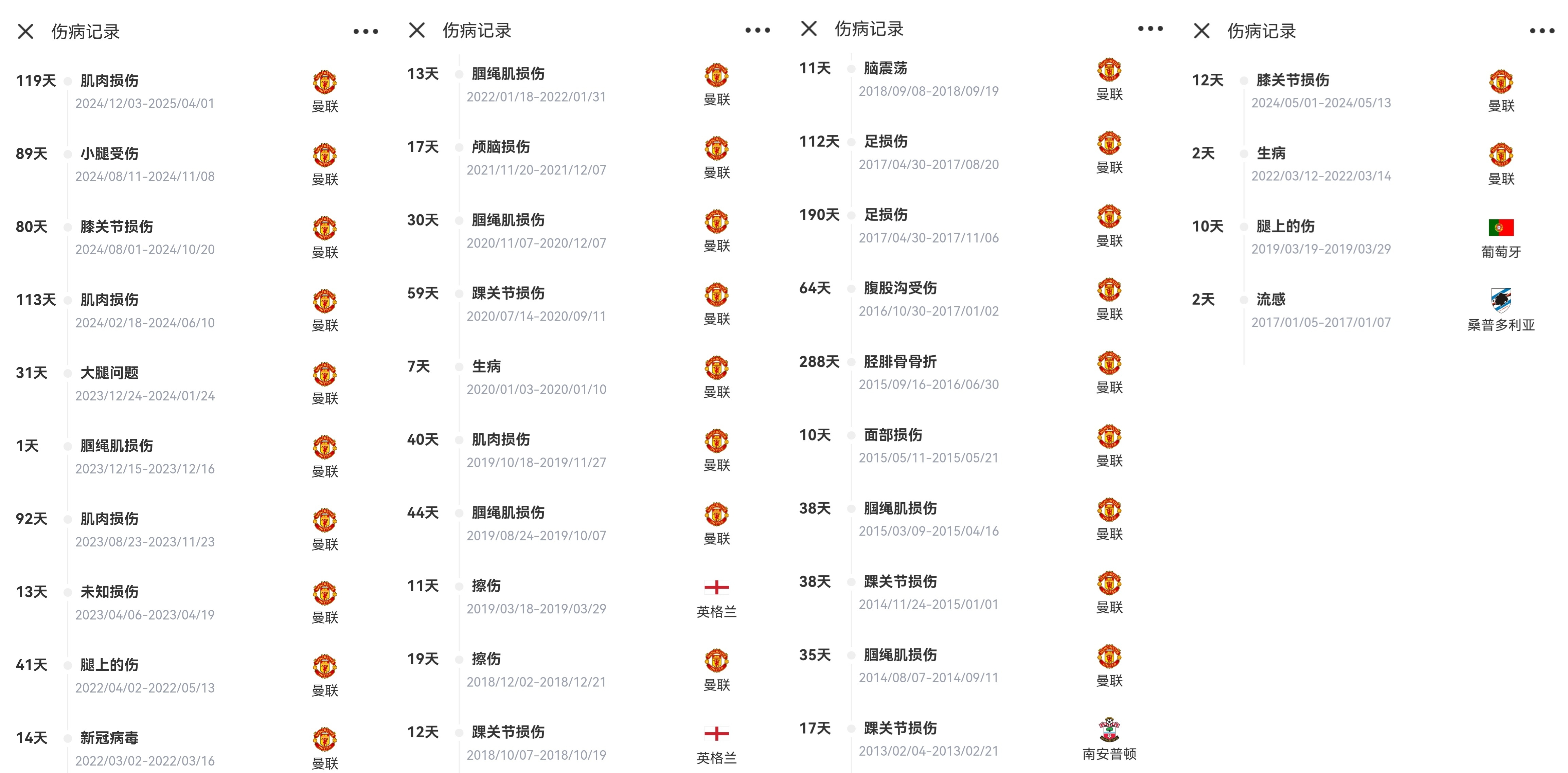 以下為盧克肖和B費(fèi)生涯因傷缺陣的情況,左邊三頁是盧克肖的,右邊一頁是B費(fèi)的。