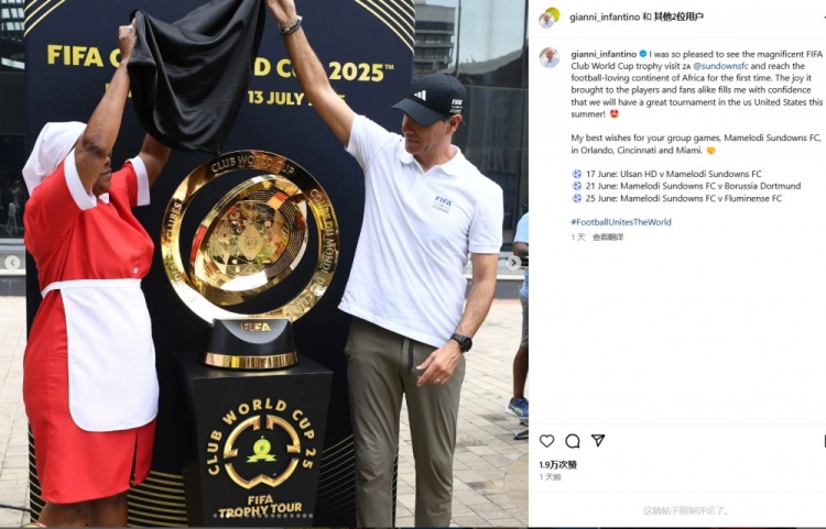 因凡蒂諾表示道:“我很高興看到這尊壯觀的世俱杯獎(jiǎng)杯造訪馬梅洛迪日落俱樂部,并首次抵達(dá)熱愛足球的非洲大陸。