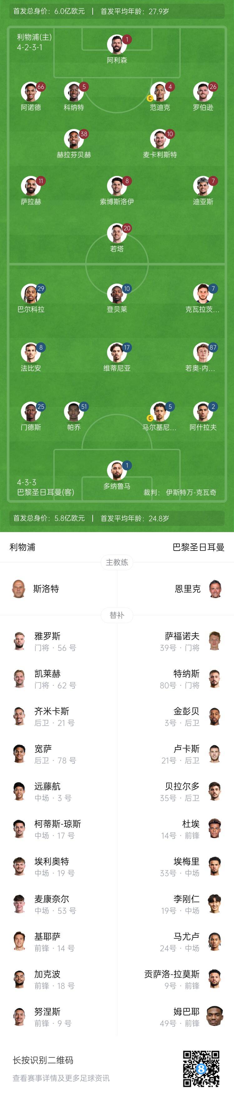 利物浦首發(fā):1-阿利森、66-阿諾德、4-范迪克、5-科納特、26-羅伯遜、10-麥卡利斯特、38-赫拉芬貝赫、8-索博斯洛伊、7-路易斯-迪亞斯、11-薩拉赫、20-若塔