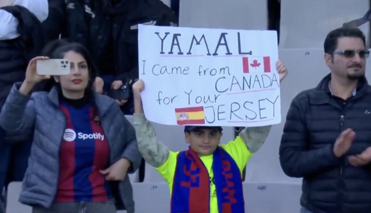 這位小球迷手舉橫幅,上面寫著:“亞馬爾,我來(lái)自加拿大,想要你的球衣!”
