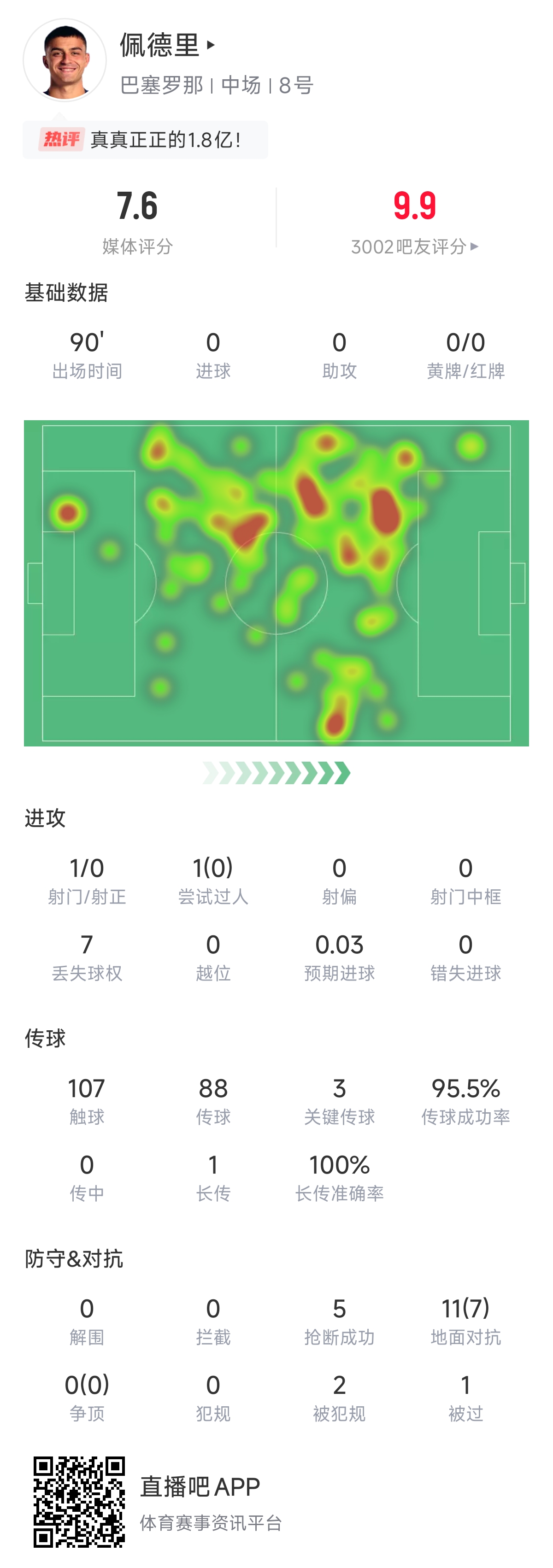 佩德里本賽季幾乎全勤,只缺席巴薩一場(chǎng)比賽,他在41場(chǎng)比賽里貢獻(xiàn)5球6助。不過(guò)進(jìn)球數(shù)據(jù)并不能體現(xiàn)出佩德里的表現(xiàn)。例如他在本場(chǎng)比賽首發(fā)出戰(zhàn),貢獻(xiàn)3次關(guān)鍵傳球,觸球107次僅有7次丟失球權(quán),傳球成功率達(dá)到95.5%,另外他還有5次搶斷以及7次地面對(duì)抗成功。
