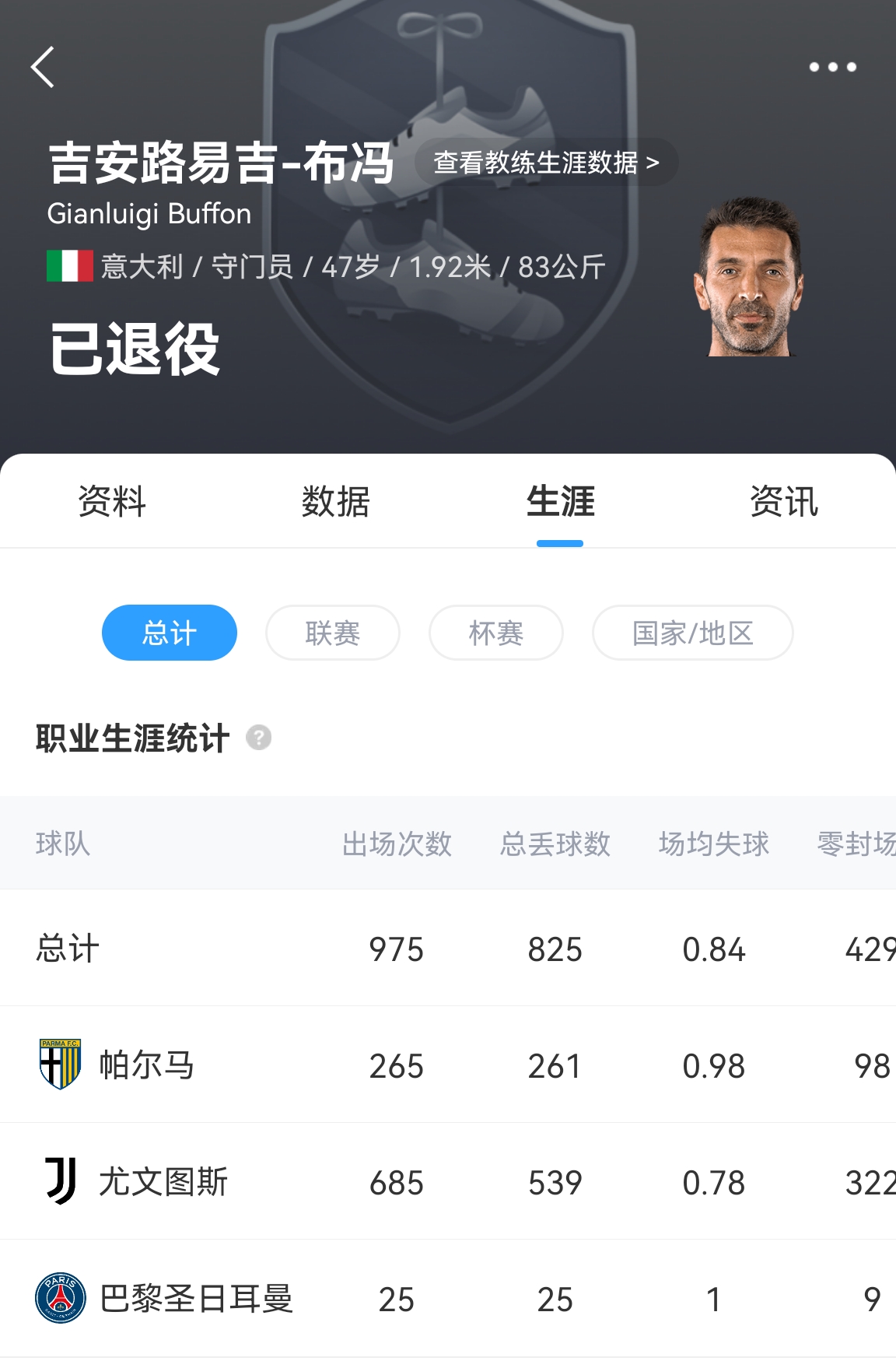 2023年8月45歲的布馮宣布退役時(shí),他的俱樂部出場數(shù)達(dá)到了975場,國家隊(duì)出場數(shù)達(dá)到了176次。