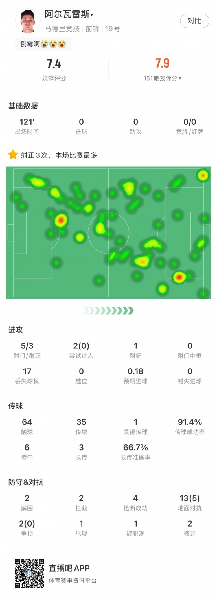 3月13日訊 歐冠1/8決賽次回合,皇馬經(jīng)過點球大戰(zhàn)淘汰馬競。阿爾瓦雷斯本場數(shù)據(jù):