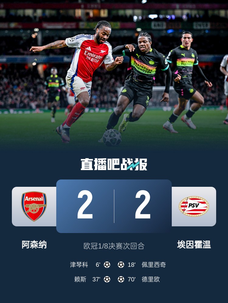 歐冠1/8決賽次回合,阿森納2-2戰(zhàn)平埃因霍溫,總比分9-3晉級(jí)八強(qiáng)。上半場(chǎng),津琴科破門,佩里西奇扳平,賴斯頭球建功,斯特林送出2次助攻&錯(cuò)失1次單刀球機(jī)會(huì);下半場(chǎng),德里歐挑射破門。