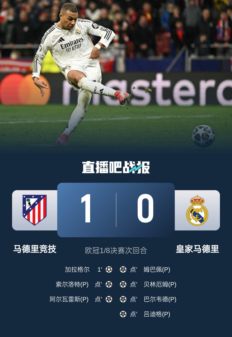 歐冠1/8決賽次回合,皇馬兩回合2-2,點(diǎn)球大戰(zhàn)4-2擊敗馬競(jìng)晉級(jí)歐冠8強(qiáng),將迎戰(zhàn)阿森納。上半場(chǎng),加拉格爾閃擊破門,阿爾瓦雷斯兩次勁射被庫爾圖瓦撲出;下半場(chǎng),姆巴佩造點(diǎn),維尼修斯主罰打飛;加時(shí)賽,雙方均未制造破門良機(jī);點(diǎn)球大戰(zhàn),阿爾瓦雷斯滑倒二次觸球進(jìn)球無效,巴斯克斯主罰被撲,略倫特?fù)糁袡M梁。