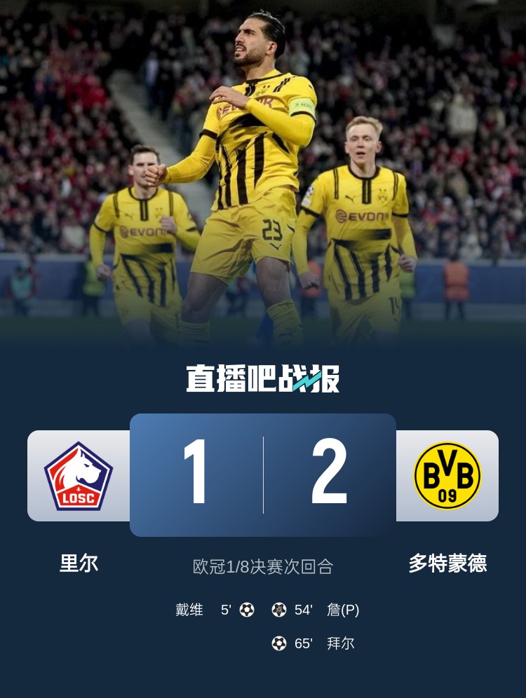 歐冠1/8決賽次回合,多特客場(chǎng)2-1里爾,總比分3-2淘汰對(duì)手。上半場(chǎng),科貝爾黃油手送禮,戴維破門,格羅斯單刀被擋,切瓦利爾三連撲;下半場(chǎng),吉拉西造點(diǎn),埃姆雷-詹點(diǎn)球扳平,拜爾爆射反超。