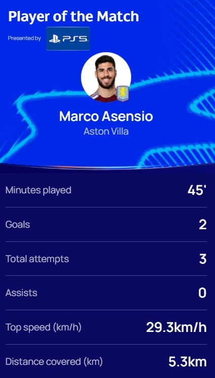 3月13日訊 在本輪歐冠,維拉3-0擊敗布魯日。本場(chǎng)比賽替補(bǔ)登場(chǎng)的阿森西奧梅開二度,3次射門,跑動(dòng)距離5.3km,賽后他也當(dāng)選歐冠官方評(píng)選出的本場(chǎng)最佳球員。 本文標(biāo)簽: 足球 英超 阿斯頓維拉