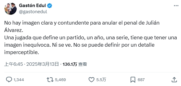 阿根廷國家隊(duì)跟隊(duì)記者埃杜(Gastón Edul)在社媒就此表達(dá)了自己的看法: