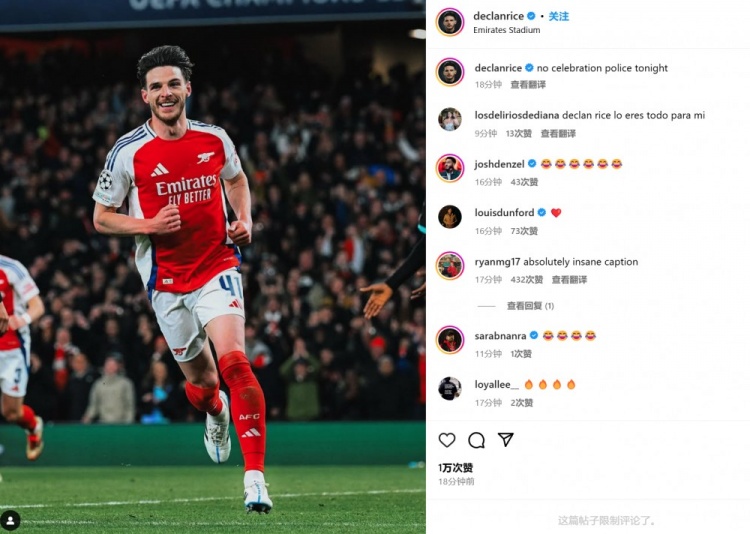 賴斯也在賽后通過社媒曬出自己進(jìn)球后的慶祝照,并調(diào)侃:“今晚沒有慶祝動作的道德警察?!?/p>