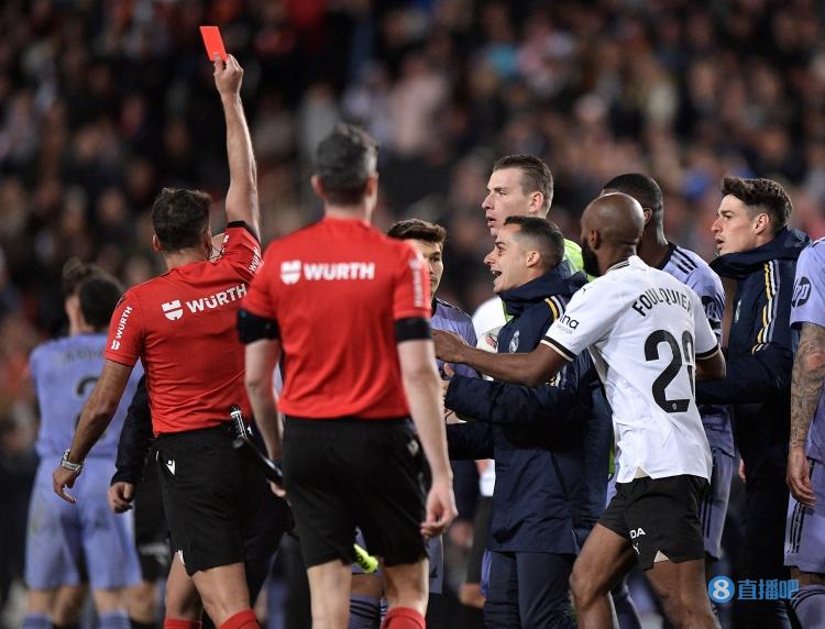 在2024年3月,皇馬2-2戰(zhàn)平瓦倫西亞最后時刻,貝林厄姆破門,但主裁提前吹響終場哨?;蜀R集體抗議,貝林厄姆對裁判出言不遜,被主裁判希爾-曼薩諾直紅罰下。