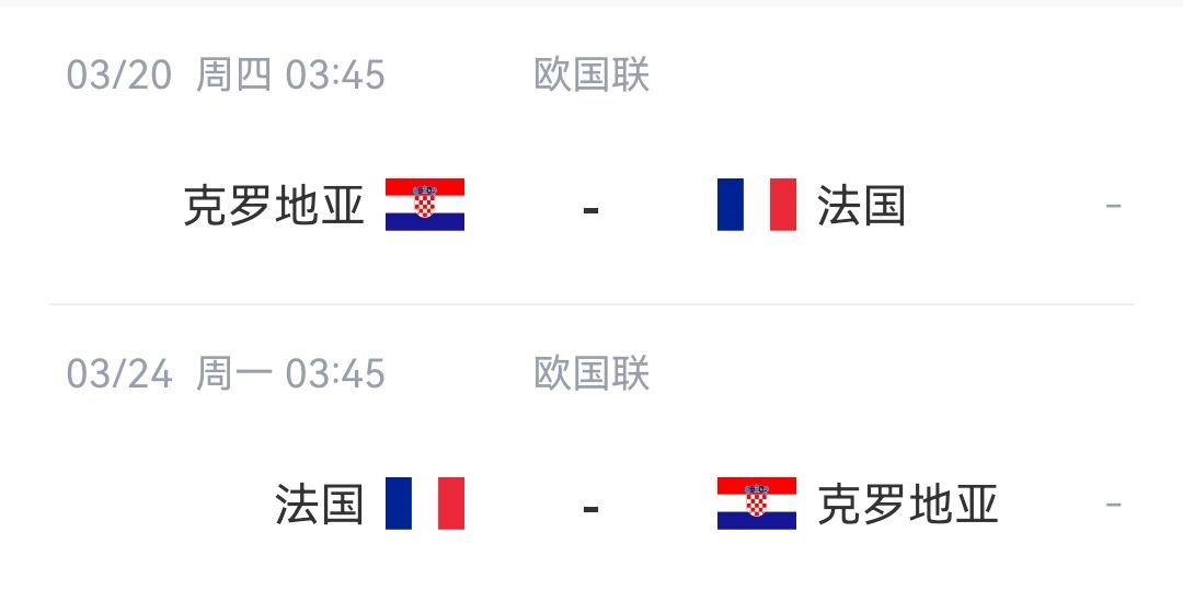 此前的歐國聯(lián)小組,法國隊(duì)力壓意大利、比利時和以色列以小組第一晉級淘汰賽,在1/4決賽中,他們要面對的是克羅地亞隊(duì)。法國與克羅地亞將在北京時間3月20日和3月24日凌晨進(jìn)行兩回合主客場的交鋒。