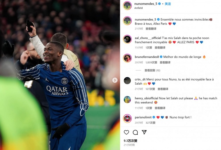 同薩拉赫對位的巴黎邊后衛(wèi)努諾-門德斯堪稱晉級的隱形功臣,他也在賽后通過社媒曬照慶祝:“團(tuán)結(jié)起來的我們是無敵的!大家做得很棒,巴黎加油!”