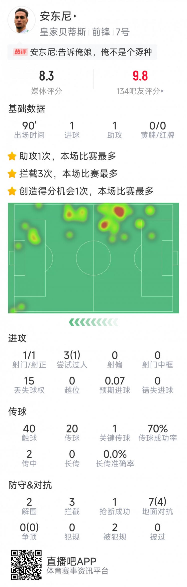 3月14日訊 在本輪歐協(xié)聯(lián)比賽中,安東尼傳射建功,以下為他在本場(chǎng)數(shù)據(jù):比賽時(shí)間90分鐘1粒進(jìn)球1次助攻1次射門3次過(guò)人1次成功40次觸球1次關(guān)鍵傳球傳球成功率70%2次解圍3次攔截1次搶斷7次對(duì)抗4次成功評(píng)分8.3分 本文標(biāo)簽: 足球 西甲 皇家貝蒂斯