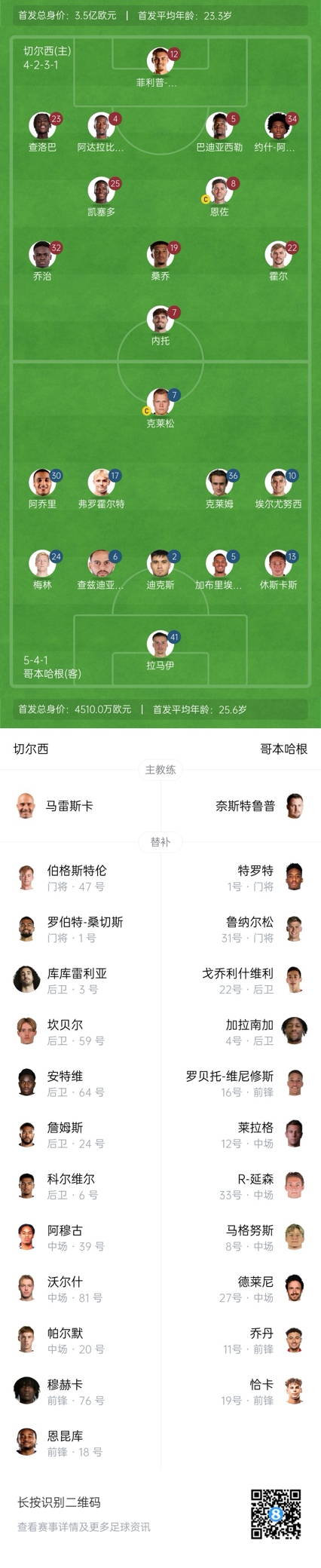 切爾西首發(fā):12-約根森、34-阿奇姆彭、23-查洛巴、4-阿達拉比奧尤、5-巴迪亞西勒、25-凱塞多、8-恩佐-費爾南德斯、32-喬治、22-霍爾、19-桑喬、7-內(nèi)托