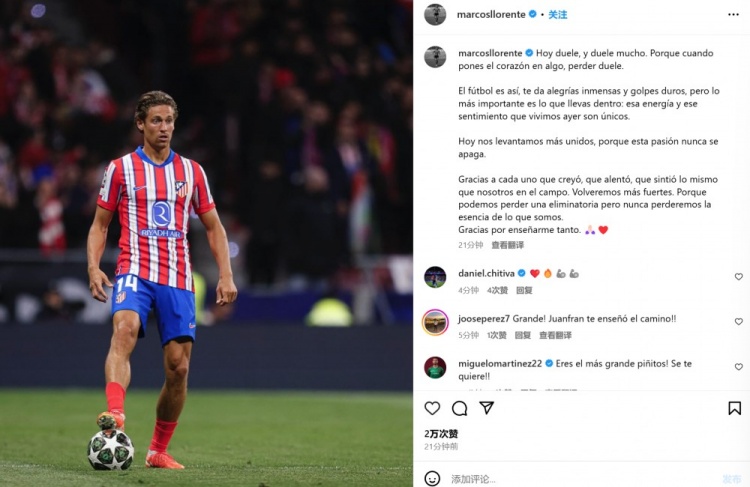 馬科斯-略倫特表示:“我今天很痛苦,而且是非常痛苦。因?yàn)楫?dāng)你全身心投入某項(xiàng)事業(yè)時(shí),失敗就是如此痛苦。足球就是這樣,它給你帶來巨大的快樂和沉重的打擊。但最重要的是你內(nèi)心所擁有的東西:我們昨天所感受到的動(dòng)力和經(jīng)歷是獨(dú)一無二的。”