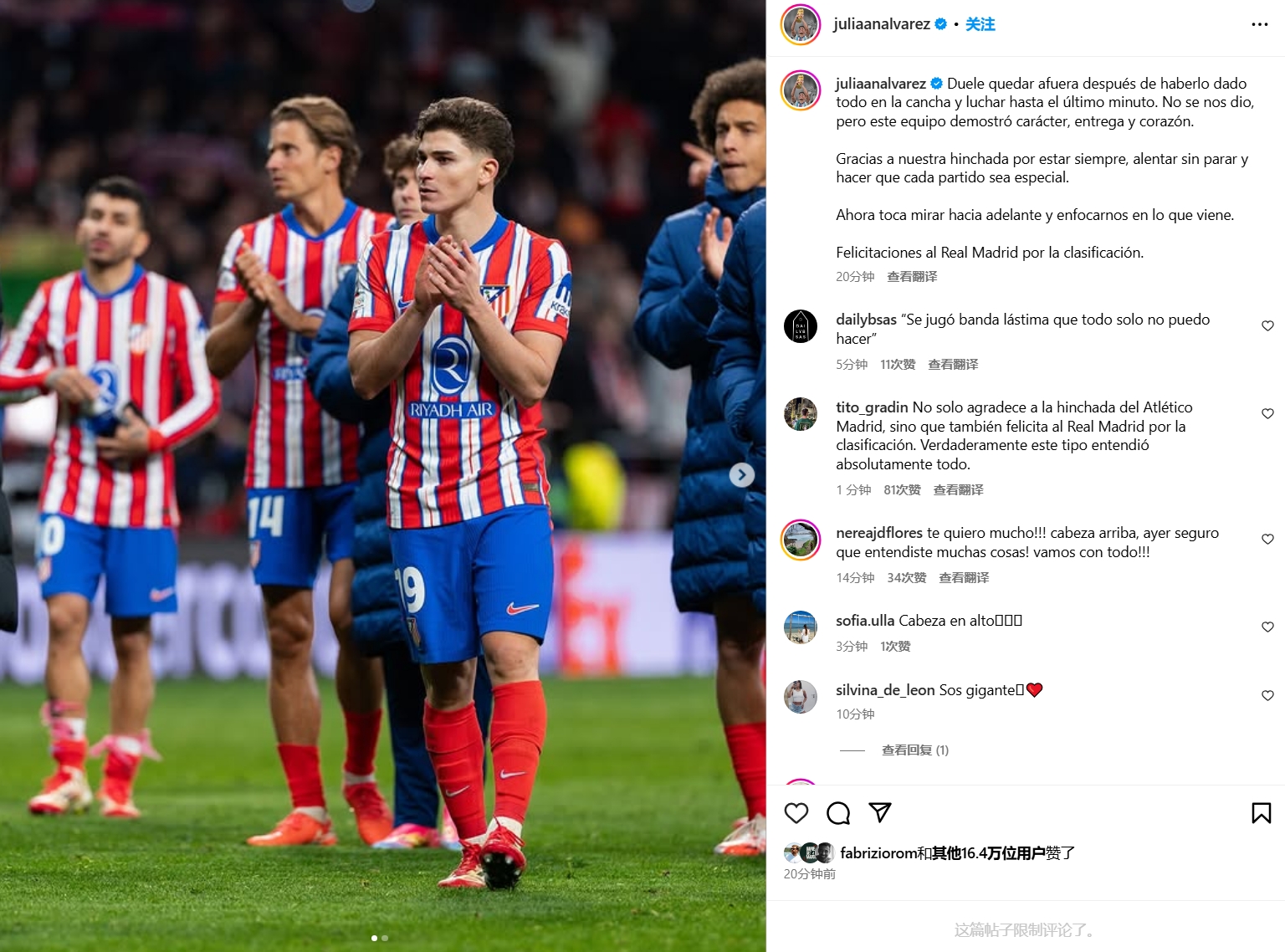 03月14日訊 歐冠16強(qiáng)對(duì)決,馬競在點(diǎn)球戰(zhàn)不敵皇馬,阿爾瓦雷斯點(diǎn)球戰(zhàn)點(diǎn)球罰進(jìn)但因二次觸球被判無效。阿爾瓦雷斯如今在社媒發(fā)文談到感想。