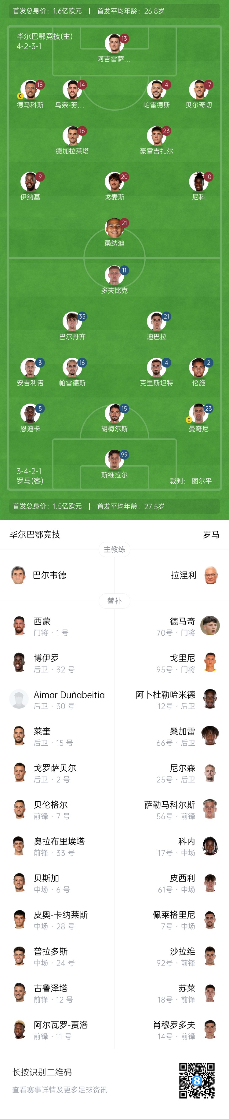 羅馬首發(fā):99-斯維拉爾、5-恩迪卡、15-胡梅爾斯、23-曼奇尼、3-安吉利諾、16-帕雷德斯、4-克里斯坦特、2-倫施、35-巴爾丹齊、21-迪巴拉、11-多夫比克