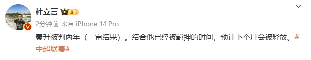 媒體人杜立言消息,秦升被判兩年(一審結(jié)果)。結(jié)合他已經(jīng)被羈押的時間,預(yù)計下個月會被釋放。 本文標(biāo)簽: 足球 中超 中國足球 轉(zhuǎn)載 Z原創(chuàng)