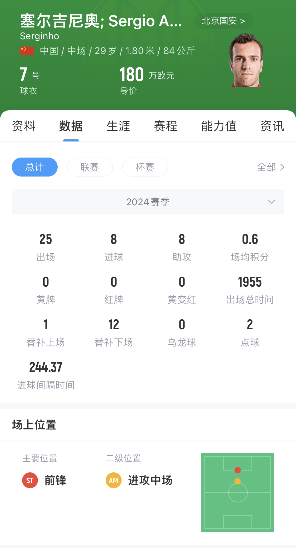 1995年3月15日出生的塞爾吉尼奧原來擁有巴西和意大利雙重國籍,2020年1月加盟長春亞泰,代表球隊出戰(zhàn)100場打進30個進球,完成23次助攻。2025賽季以40萬歐元的身價轉(zhuǎn)會至北京國安。轉(zhuǎn)換會籍成功的第二天,塞爾吉尼奧也將迎來自己的30歲生日。