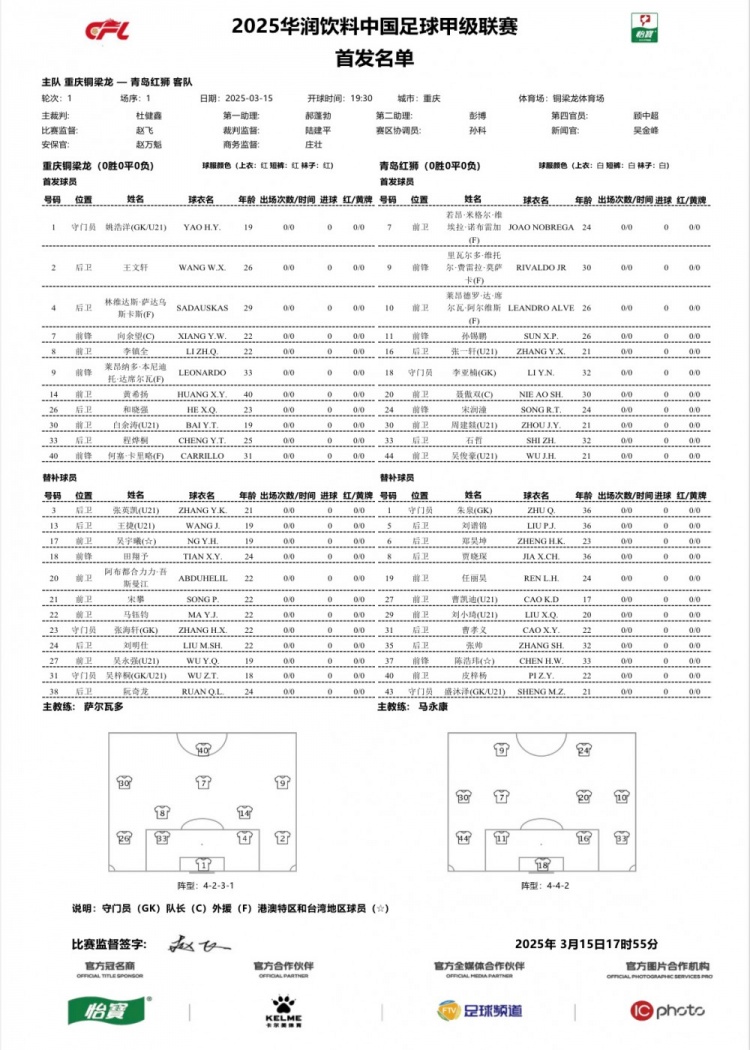 3月15日訊 中甲首輪比賽,重慶銅梁龍主場迎戰(zhàn)青島紅獅,目前雙方首發(fā)名單已經公布。