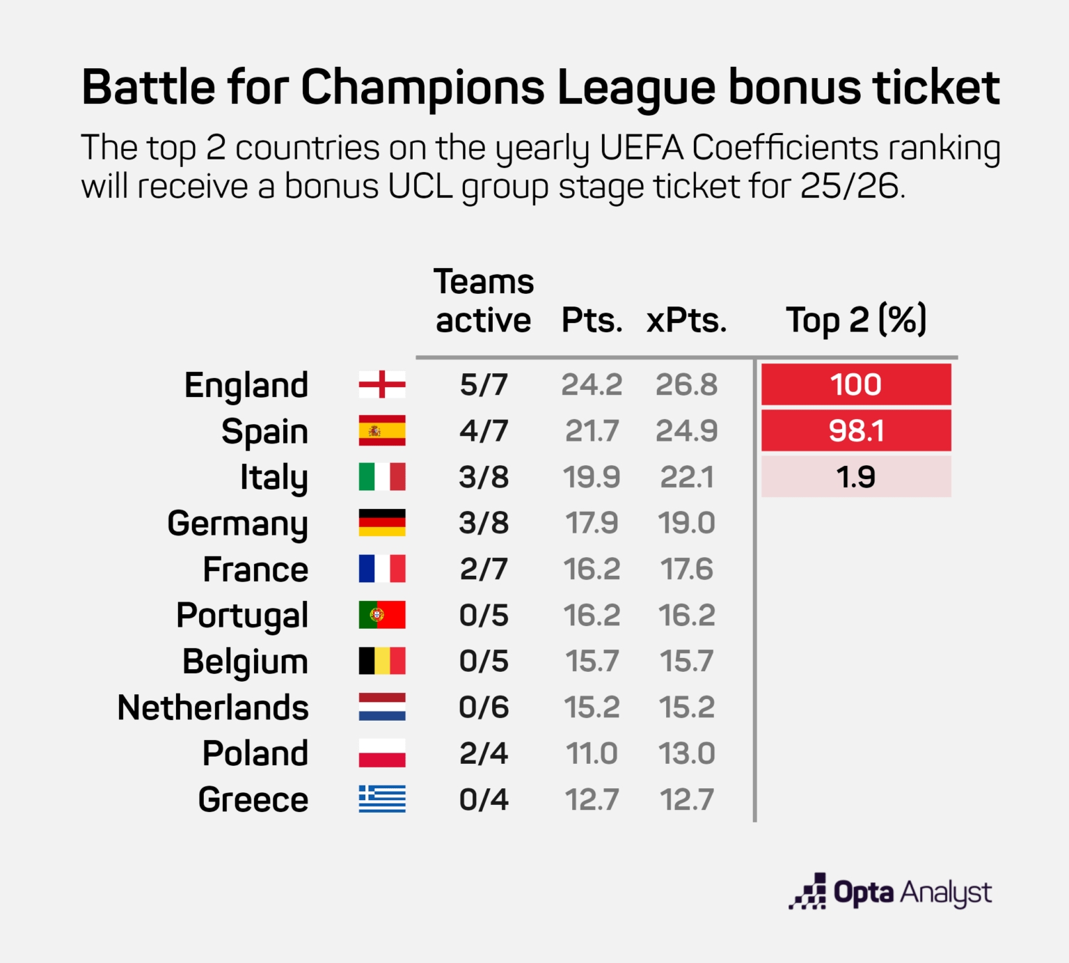 目前英格蘭手握24.25的積分,領(lǐng)先第二名西班牙2.5分??紤]到歐足聯(lián)系數(shù)分系統(tǒng)的運(yùn)作方式,在接下來的歐戰(zhàn)1/4決賽階段,只要有一支英格蘭球隊贏得一場比賽,就可以為英超鎖定一個額外的歐冠聯(lián)賽席位。