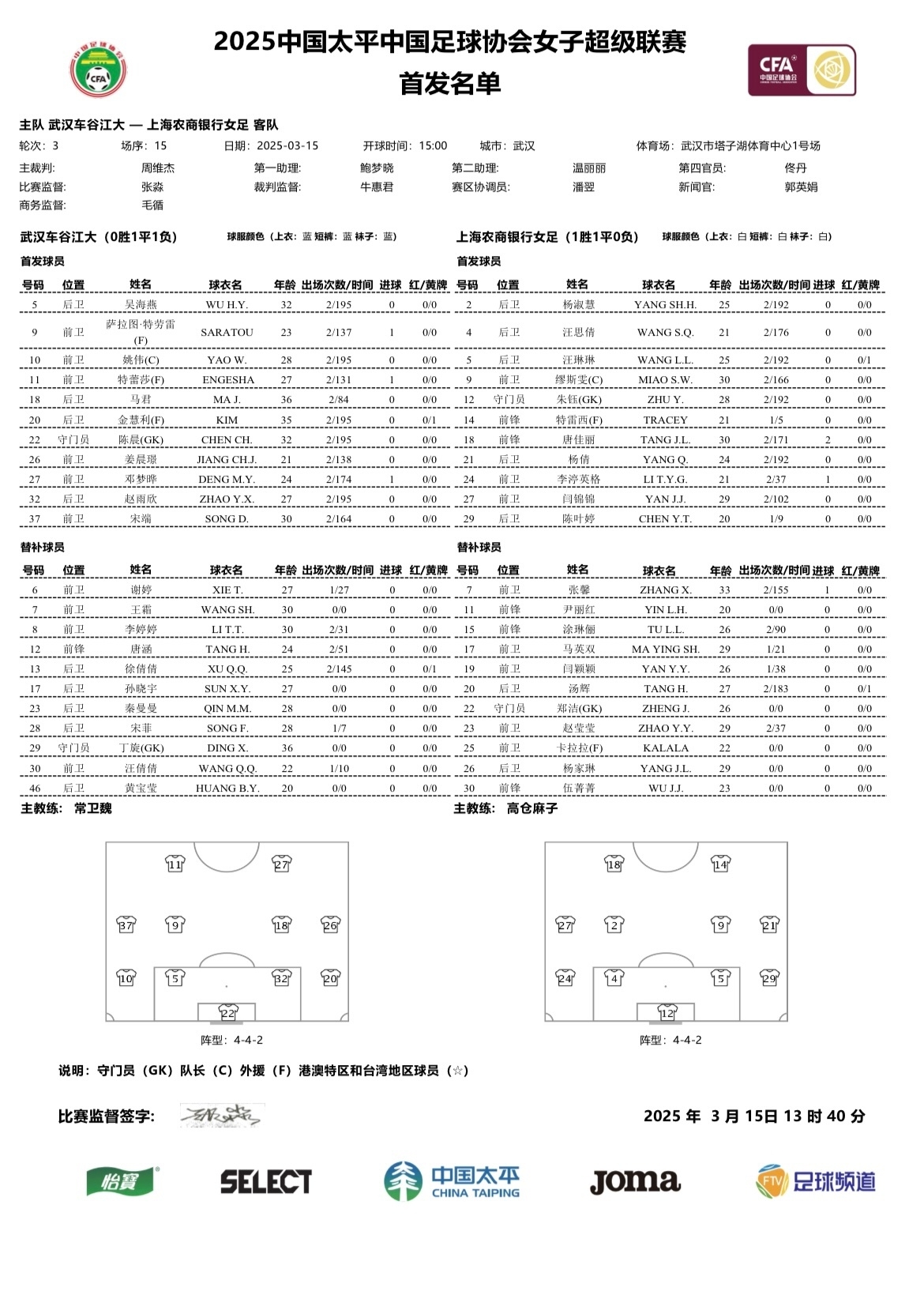 3月15日訊 本周末,女超聯(lián)賽第3輪將繼續(xù)進(jìn)行,武漢車谷江大將在今天下午15:00主場迎戰(zhàn)上海農(nóng)商銀行。賽前公布的出場名單中,武漢女足的王霜繼續(xù)位列替補(bǔ)。